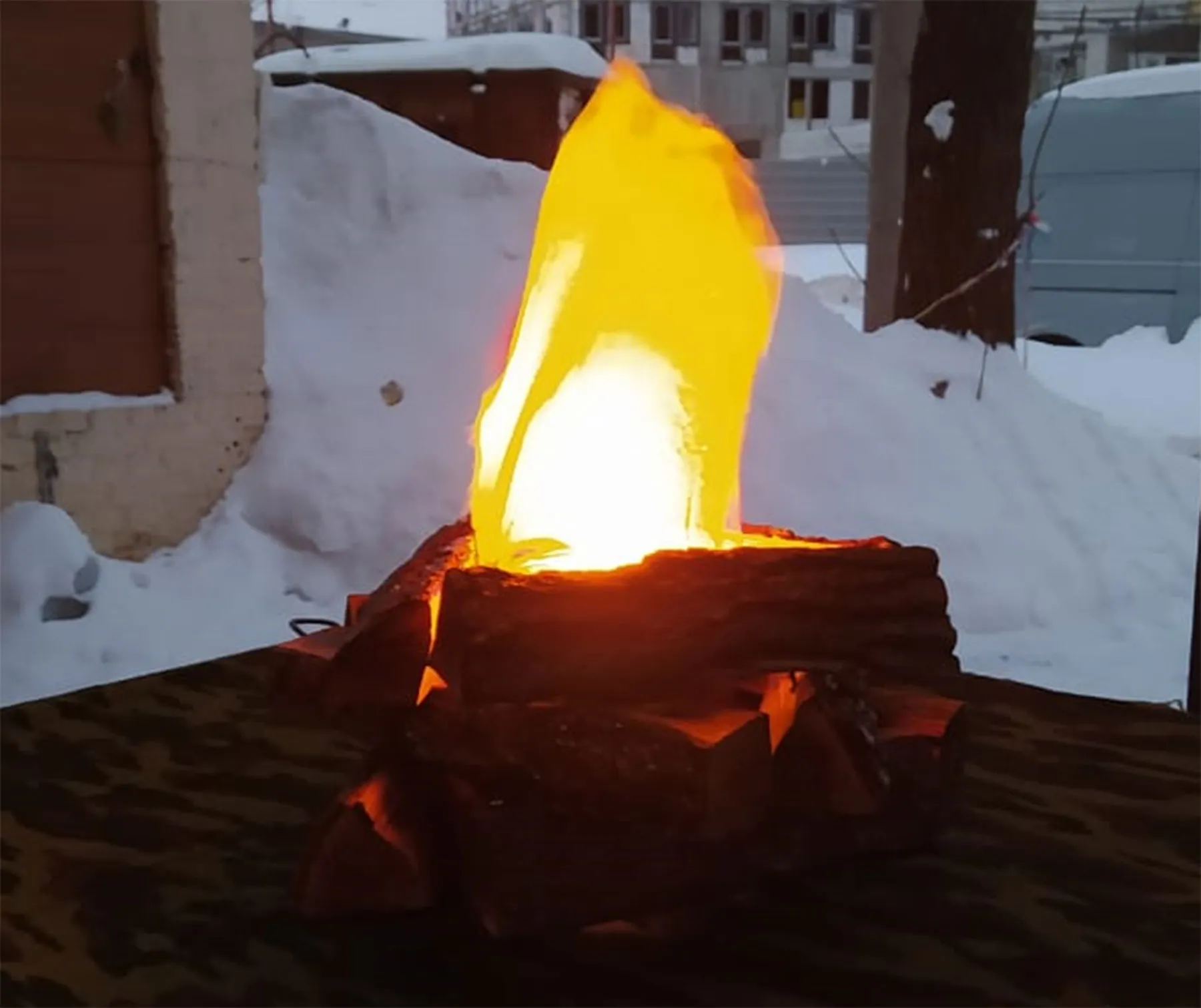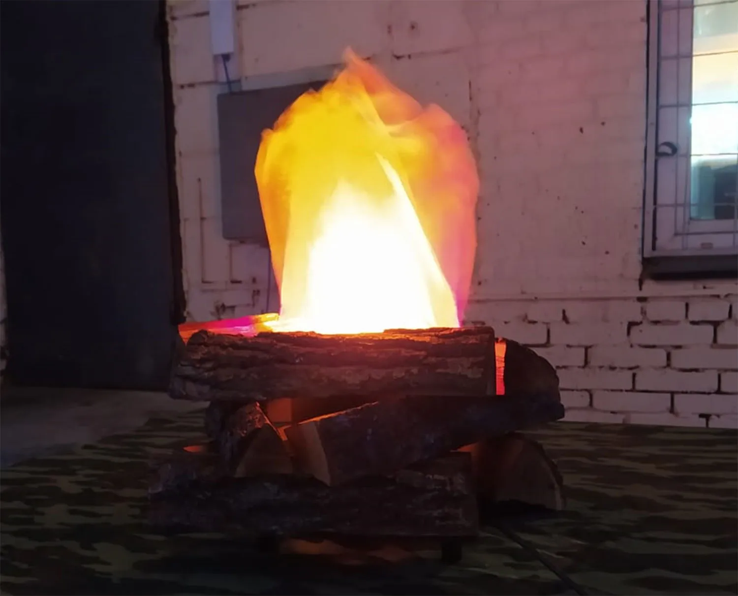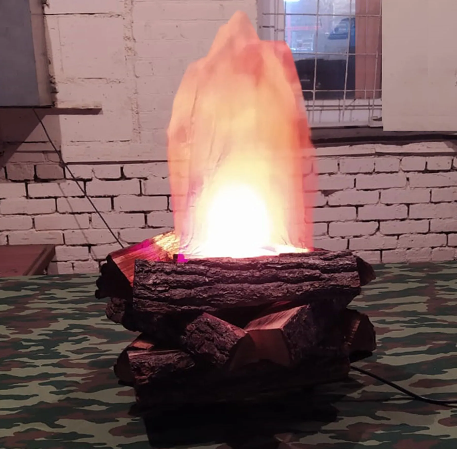 Принцип работы изделия крайне прост: кусок ткани (два куска тончайшего шелка) крепятся над небольшим вентилятором. Цветные светодиодные лампочки освещают ткань, развевающуюся в направленном потоке воздуха вентилятора. Сочетание движущейся над костром ткани и цветной LED-подсветки создаёт на сцене весьма реалистичный эффект пламени…