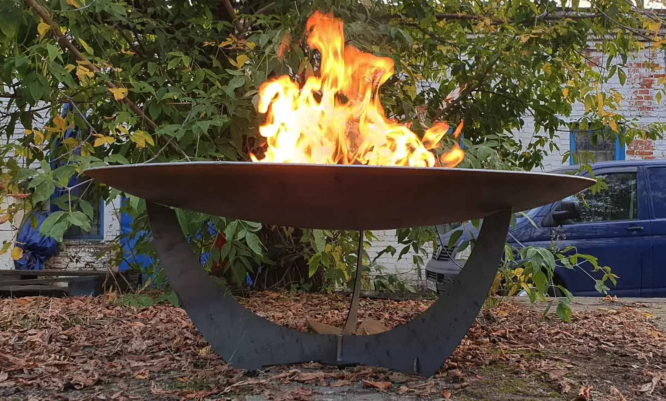 Диаметр костровой чаши 96 сантиметра, глубина чаши 10 сантиметров, толщина метала 6 миллиметров. Материал изготовления - конструкционная сталь марки Ст3.